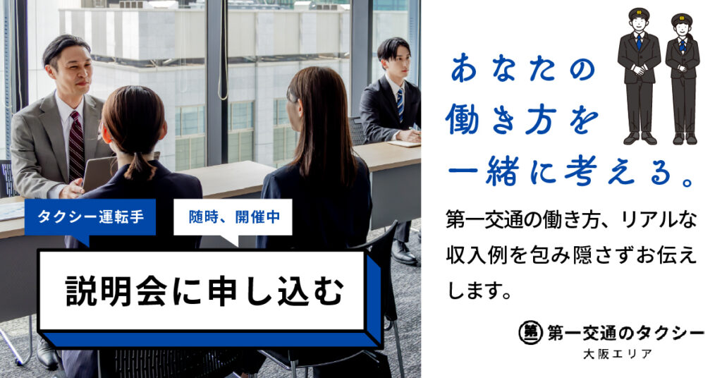 大阪第一交通では、二種免許取得費用の会社負担制度(条件あり)や研修体制が整っており、初めての方でも安心してスタートしやすい環境が用意されています。
